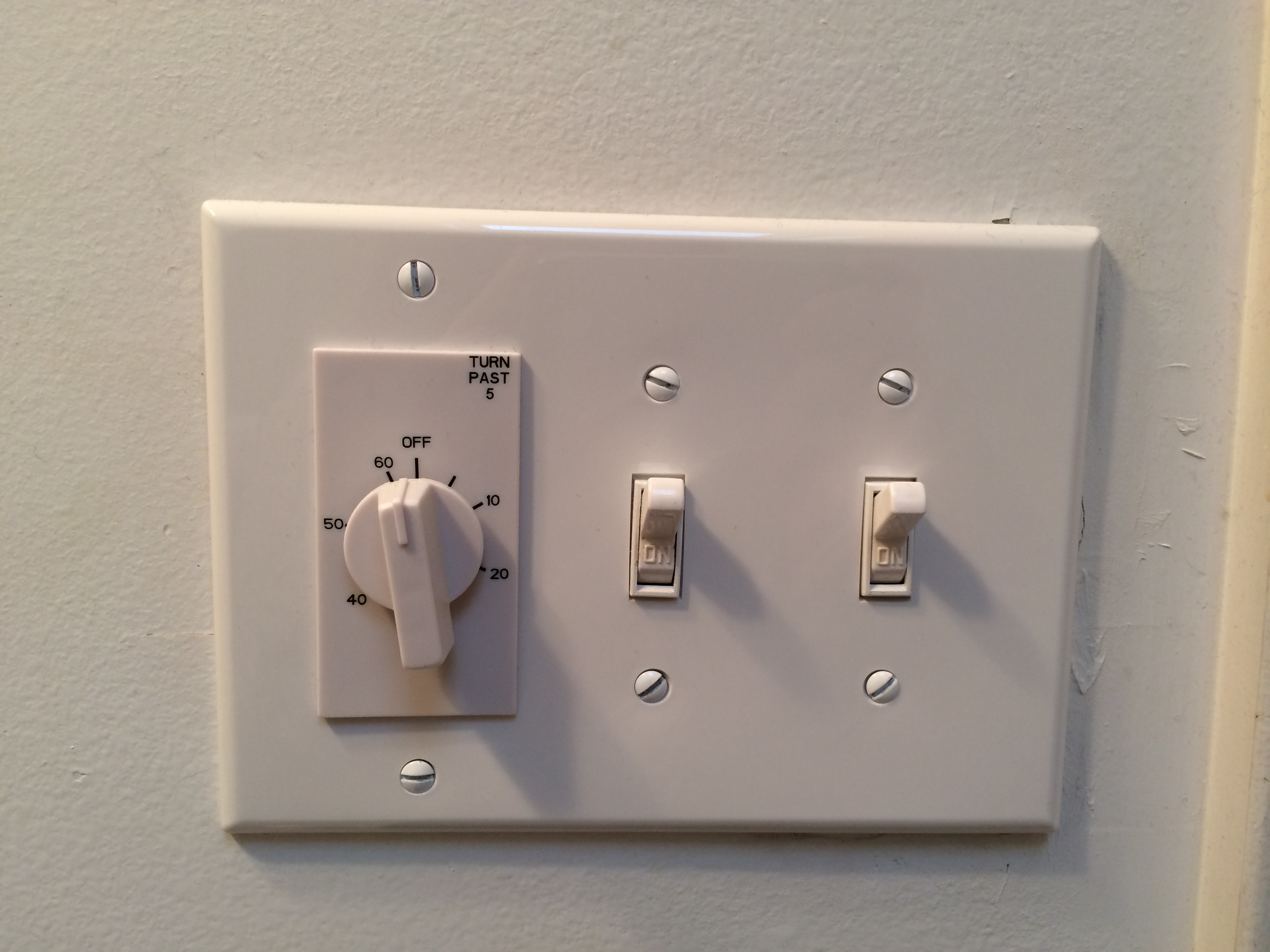 It’s the switches in my bathroom for the light, fan, and heater. The previous owners renovated the house a few years before we bought it, and the second floor bathroom had been a new addition. For some reason, they didn’t install any type of heating system in the bathroom and the only means of ventilation was a skylight. That’s fine for late spring, summer, and early fall, but when the Husband and I spent our first winter in the house, we found out the bathroom gets cold. Of course, we can use the one on the first floor, but it’s not as convenient since our bedroom is on the second floor. We spent a lot of that winter going up and down the stairs. This past fall, we got smart and hired an electrician to install a ceiling heater/fan. I think most people use the timer for the fan, but we both agreed that it would be more useful for the heater since it would shut off by itself if we accidentally forget about it. The fan means we don’t have to open the skylight in the cold weather. I was especially grateful for the heater since the polar vortex came around and temps in our area went down to the single digits.